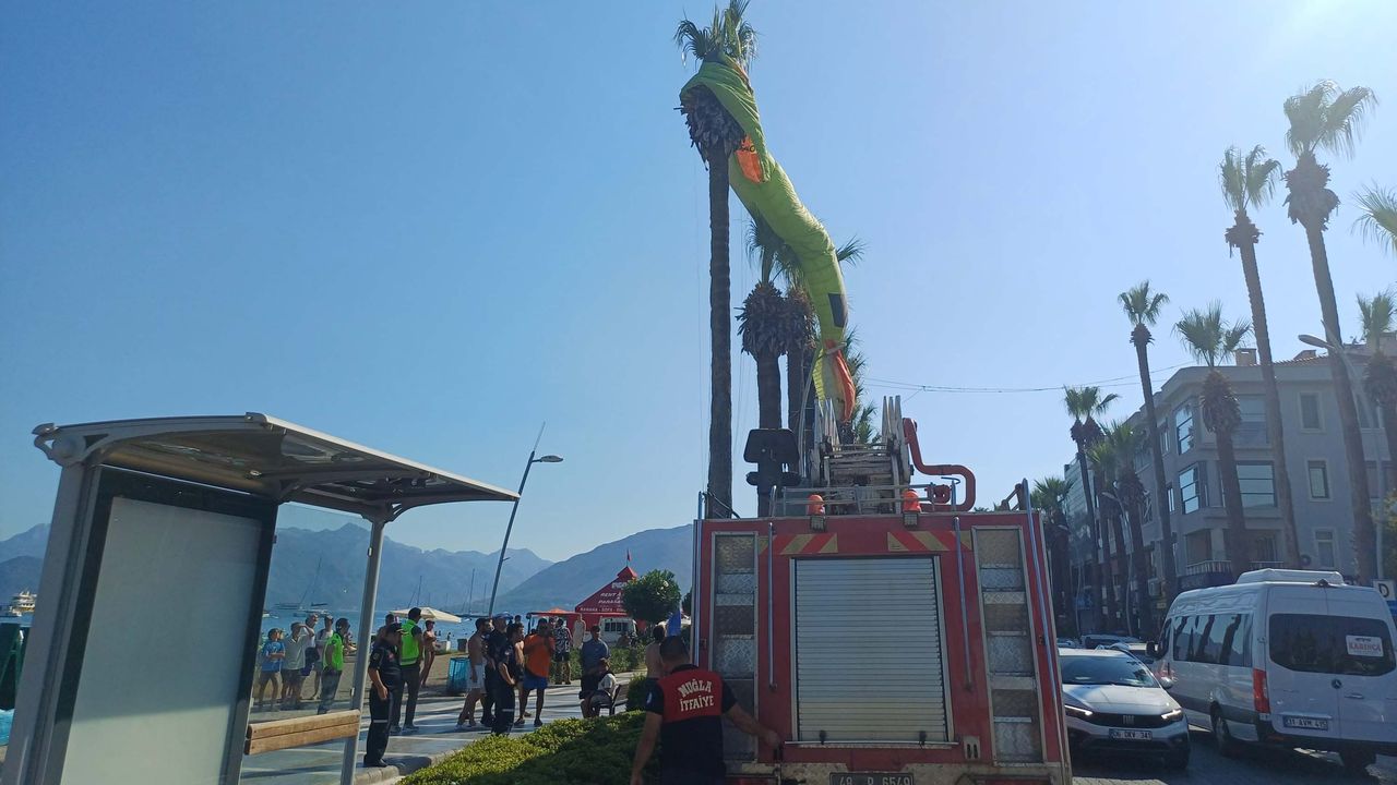 Muğla'nın Marmaris ilçesinde deniz paraşütü güvenli iniş noktası ararken, ters rüzgar nedeniyle sahildeki palmiye ağacına takıldı. İki paraşütçü itfaiye ekipleri tarafından kurtarılırken, sağlık durumlarının iyi olduğu öğrenildi.