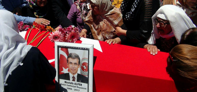 Türk bayrağına sarılı tabuta merhum Başsavcı Mustafa Alper'in eşi ve kızlarının sarıldığını gösteren fotoğrafın altında ise şu ifadeler yer aldı: