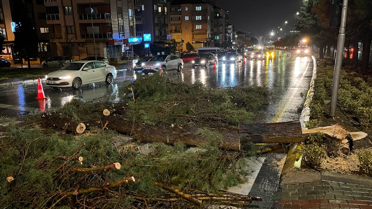 Ali Aygören Bulvarı'nda refüjde bulunan çam ağacı kökünden sökülerek yola devrildi.