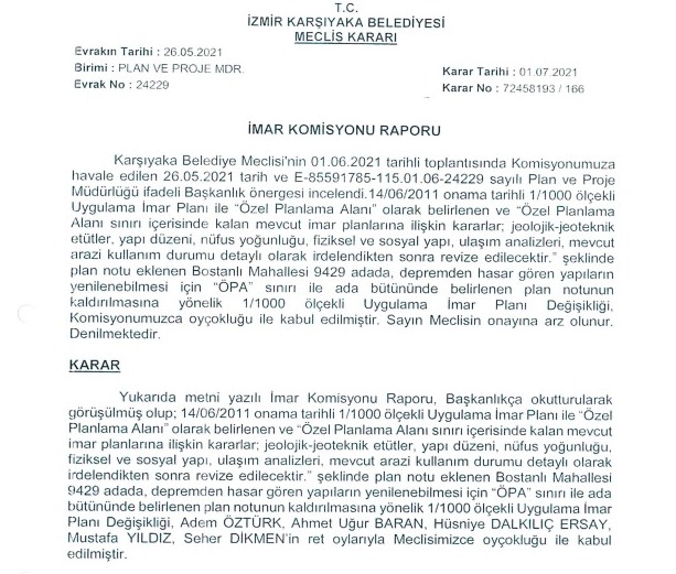 Öte yandan, konu Karşıyaka Belediyesi'nin meclis toplantısında kabul edilirken Cumhur İttifakı üyeleri Adem Öztürk, Ahmet Uğur Baran, Hüsniye Dalkılıç Ersay, Mustafa Yıldız ve Seher Dikmen ret oyu kullanmışlardı.