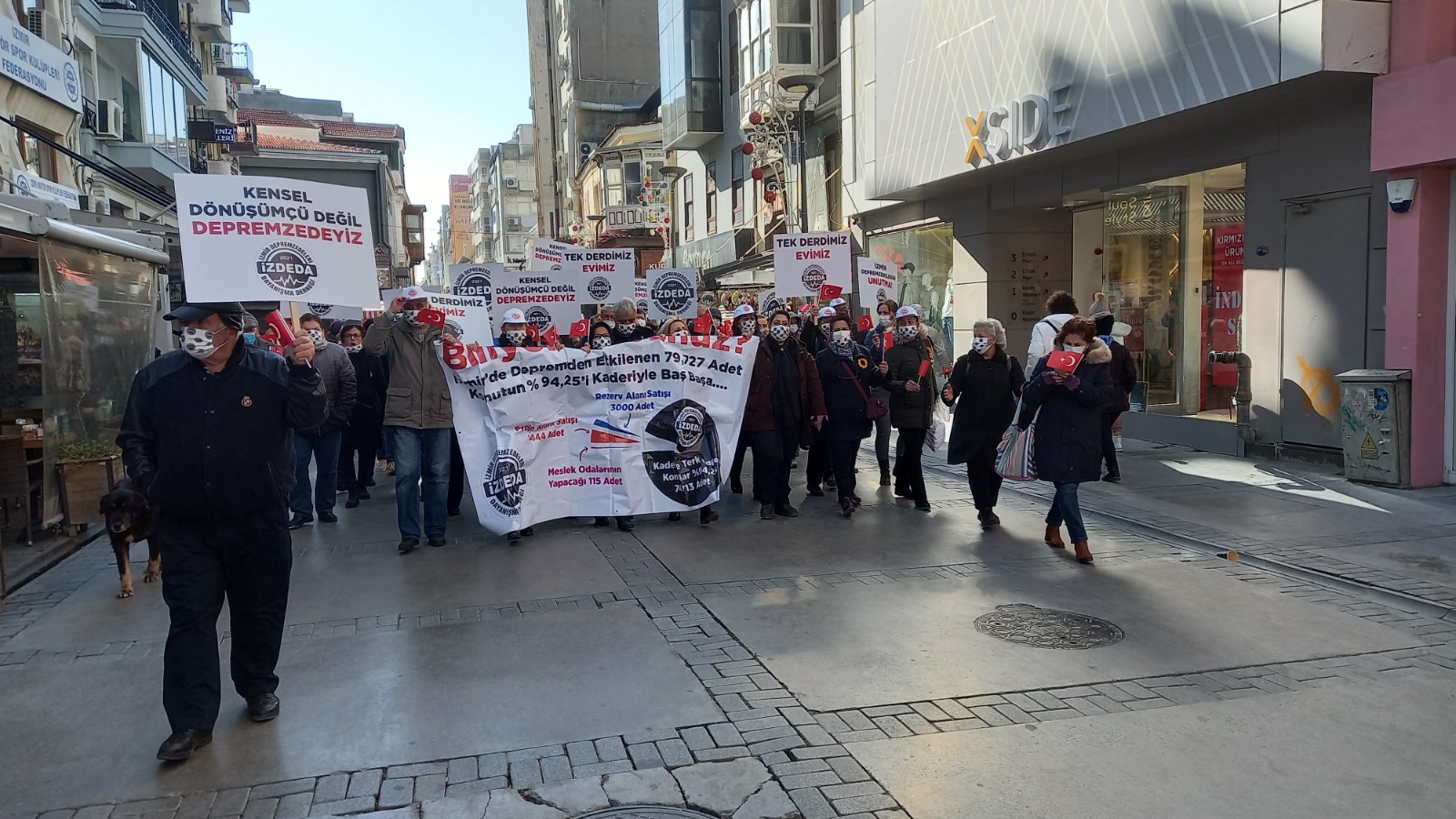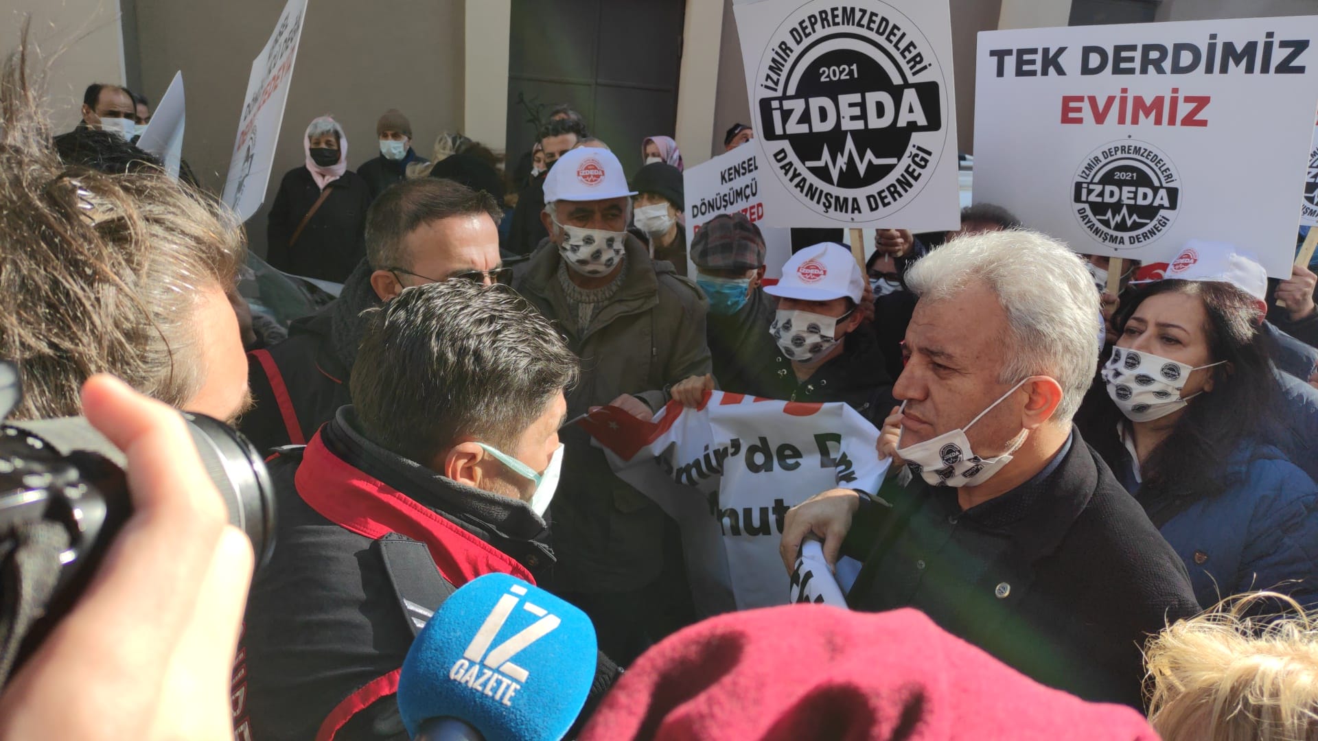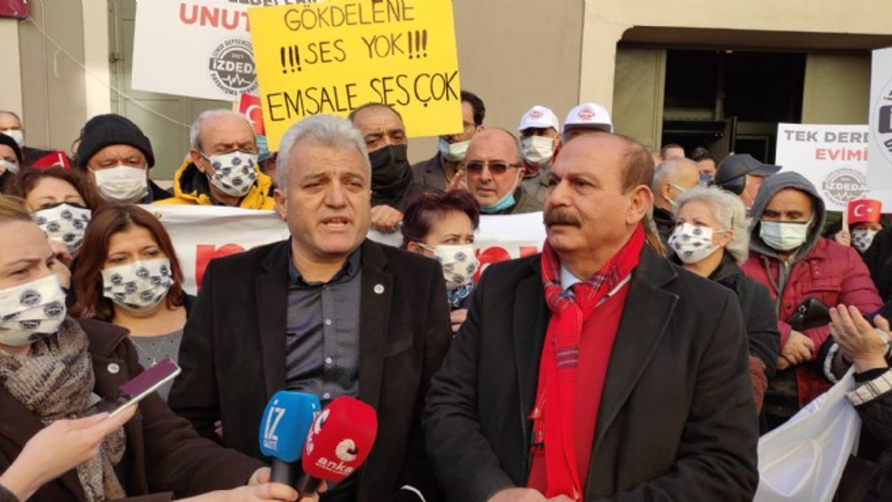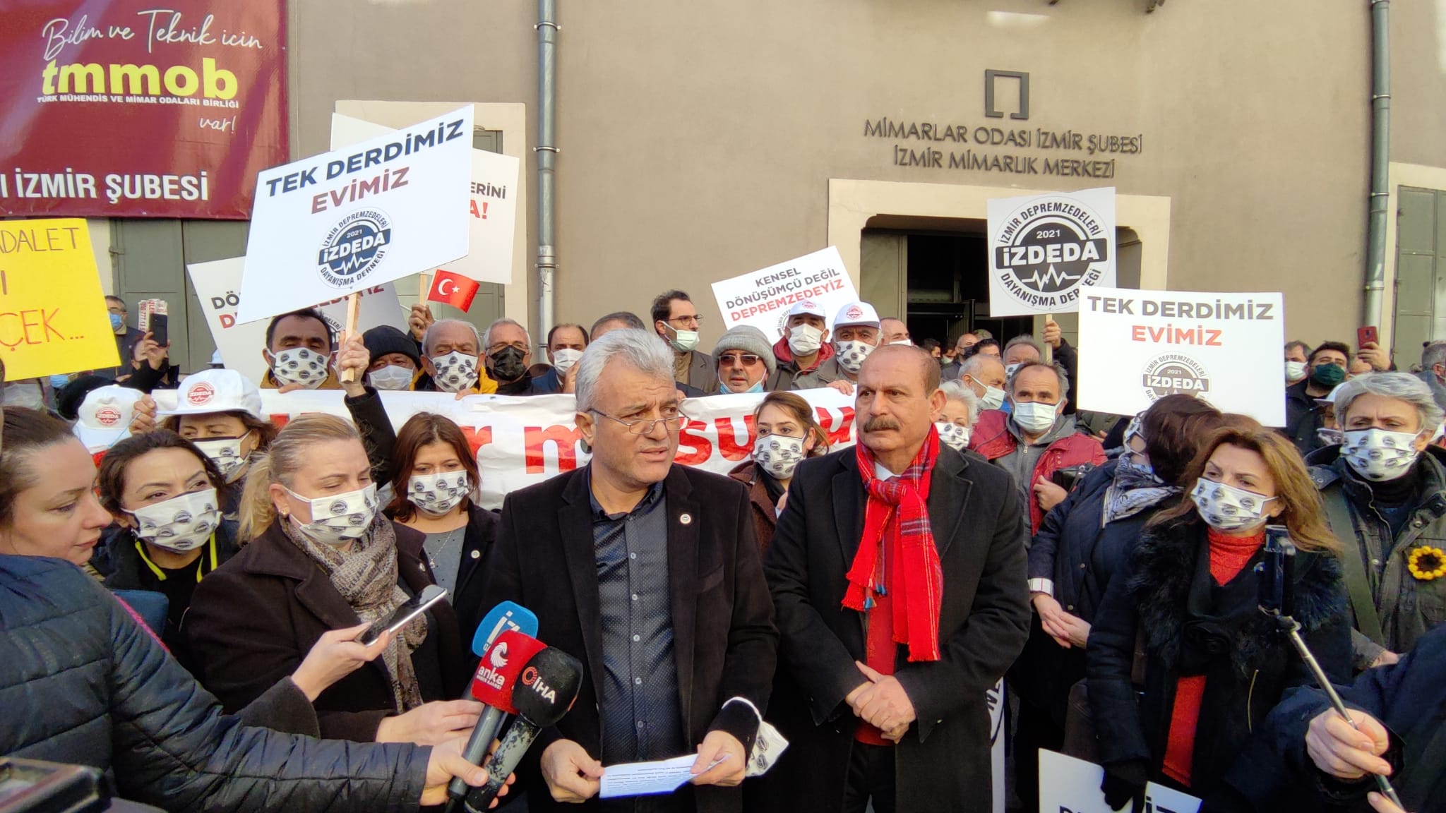 Alınan karar sonrası depremzedeler 'emsalimize dokunma' çağrılarında bulunurken, TMMOB'dan geri adım gelmemesi nedeniyle depremzedeler TMMOB İzmir İl Binası önünde basın açıklaması düzenledi. Katılımcılar adına İzmir Depremzedeleri Derneği Başkanı Haydar Özkan açıklamalarda bulunurak, 'Ekim 2020 tarihinde gerçekleşen depremde 79 bin 272 bağımsız bölüm hasar almış ve yaklaşık 250 bin yurttaşımız depremle birlikte evini terk etmek zorunda kalmıştır. Yakınlarıyla birlikte yaklaşık 500 bin yurttaşımız mağdur olmuştur. Bir seneyi aşan süreden bu yana İzmirli depremzedelerin mağduriyetlerini ve içinde bulundukları çözümsüz durumu haykırmaktayız. Geçtiğimiz süreçte sesimizi sağır sultan dahi duymuştur, mağduriyetimizi anlamış ve içinden çıkılmaz bir durumda olduğumuzun farkına varmıştır. Geldiğimiz noktada tarihsel birikimi ve kültürünün de etkisiyle, yaşamın her alanında halktan, emekten yana olan TMMOB'un İzmir Büyükşehir Belediye Meclisi'nce onanan imar artışının iptaline dönük açmış olduğu dava biz depremzedeleri hayal kırıklığına uğratmıştır. TMMOB'un İzmirli depremzedeleri duymamakta ve görmemekte olduğu düşüncemiz bir kez daha tescillenmiştir' dedi.