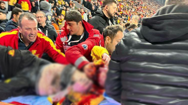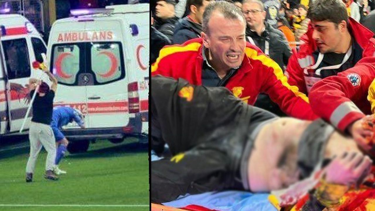 Gürsel Aksel Stadı'ndaki karşılaşmada, sahaya giren bir taraftarın köşe gönderiyle vurduğu Ozan Evrim Özenç, ambulansla Medicana International İzmir Hastanesine kaldırıldı.