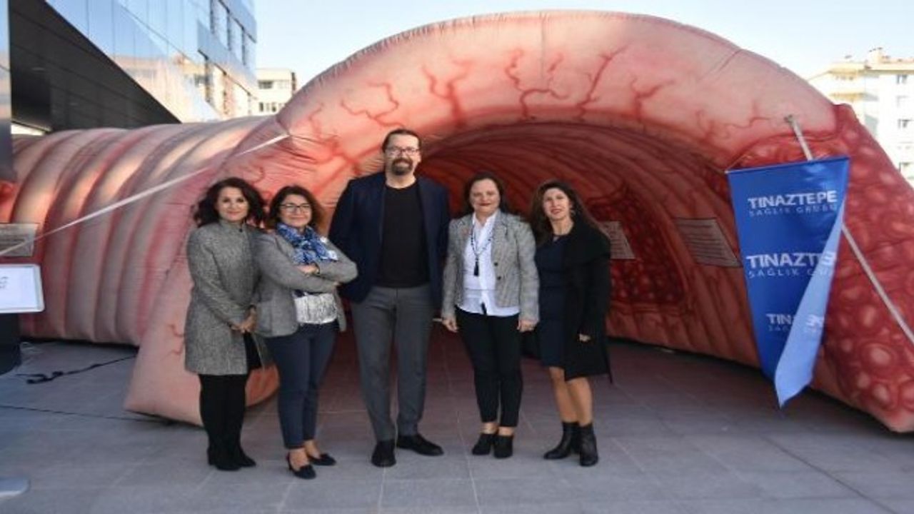 Ülseratif Kolit ve Crohn Hastalığı Haftası dolayısıyla Tınaztepe Galen Hastanesi'nde, kalın bağırsak hastalıkları farkındalık etkinliği gerçekleştirildi. Etkinlikte, Kanserle Dans Derneği ve Meme Kanseri Derneği işbirliğiyle 12 metre uzunluğunda dev bağırsak maketi sergilendi. Hastane girişine yerleştirilen dev maketin içine girerek burada kanser evrelerini görme fırsatı yakalayan hastalar, aynı zamanda maket içerisinde yer alan bağırsak dokusuyla ilgili bilgileri de okudu. Sağlıklı ve hastalıklı bağırsak dokularını aşama aşama gösteren maketin sonunda vatandaşlar, sağlık çalışanları tarafından erken teşhisin önemi hakkında bilgi aldı. Etkinlik hakkında konuşan Tınaztepe Galen Hastanesi Başhekimi Prof. Dr. Gökhan Akbulut, 'Kalın bağırsak kanserine dikkat çekmek amacıyla düzenlediğimiz etkinlik kapsamında, bir hafta boyunca kolon maketi hastanemizin girişinde duracak. Maketin içerisinde ülseratif kolit ve crohn hastalığı belirtileri dışında, kolon kanseri, polipler, partiküller gibi çok sık görülen kalın bağırsak hastalıkları ile ilgili bilgiler yer alıyor. Dev boyuttaki maketin içerisine vatandaşlar rahatlıkla girebiliyor' dedi.