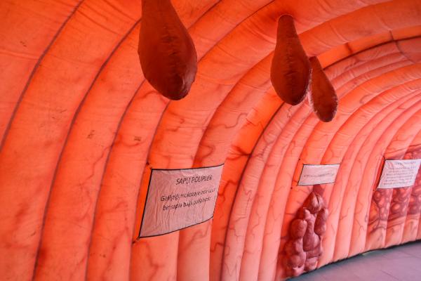 Kanserle Dans Derneği Başkan Yardımcısı Güzin Yıldırım ise, 'Yaklaşık 6 yıldır kolon maketini açıyoruz. Amacımız bağırsak hastalıklarına dikkat çekerek insanları kolonoskopiye yönlendirmek. Maketimiz yaklaşık 12 metre uzunluğunda ve yarım ay şeklindedir ve 7 kişi yan yana yürüyebilecek derecede geniştir. Vatandaşların bu görsellere bire bir temas edebilmeleri oldukça önemli. Kolon kanseri ileri evrelerde anlaşılmayabiliyor. Büyük bir görsel olduğu için etkili bir yöntemle doktorlara yönlendirebiliyoruz. Kanser tedavileriyle ilgili vatandaşlara broşür dağıtarak yalnızca kolon kanseri değil, meme, rahim, akciğer kanseri gibi birçok tür hakkında bilgi veriyoruz' dedi. (DHA)