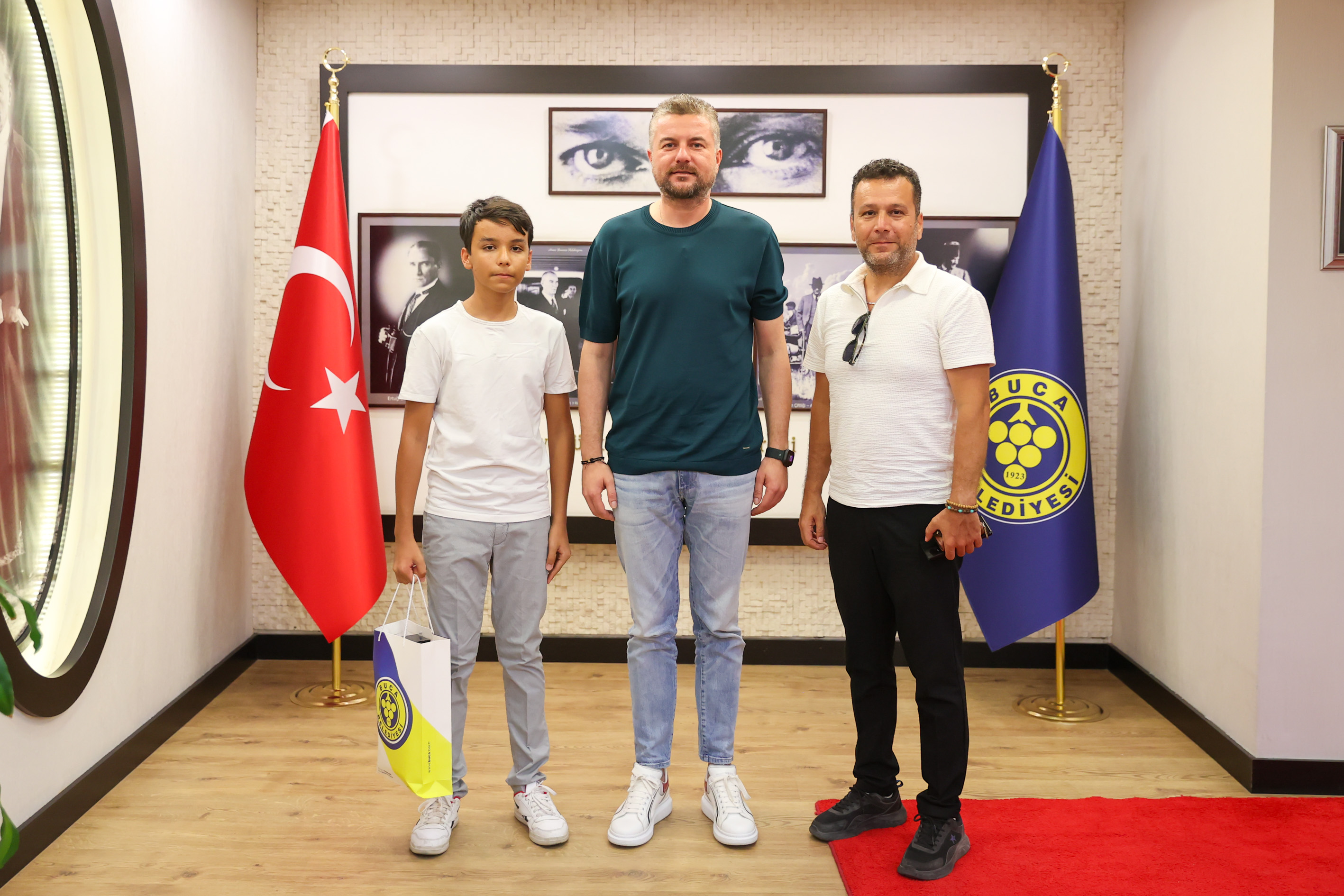 Buca Belediye Başkanı Görkem Duman, Dijital Dershane platformu aracılığıyla LGS’ye hazırlanan ve 500 tam puan alan Nuran Ece Bakırhan ile 5. sınıftan itibaren platformu aktif şekilde kullanan ve LGS’den 445 puan alan Taha Ege Aktaş’ı makamında ağırladı. Öğrencileri tebrik eden Başkan Görkem Duman, “Ülkemizde ne yazık ki eğitimde fırsat eşitsizliği var. Eğitimde fırsat eşitliğini sağlamak bizim en temel sorumluluklarımızdan biri. Her çocuğumuzun eşit koşullarda sınavlara hazırlanabilmesi için hayata geçirdiğimiz Dijital Dershane projemizin bu yılki LGS sonuçlarına yansıyan başarısı hepimiz için büyük bir gurur kaynağı. Bugün 65 öğrenci 400 puan üzerinde başarı gösterdi; 4 öğrencimiz ise ilk yüzde 1’lik dilimde yer aldı; 500 tam puan alan öğrencimiz de var. Ciddi başarılar almamız çok kıymetli. Bu başarı hikâyeleri bize gösteriyor ki doğru imkânlar sunulduğunda çocuklarımız her türlü engeli aşabiliyor. Buca’da hiçbir çocuğun imkânsızlık nedeniyle geride kalmasına izin vermeyeceğiz” diye konuştu.