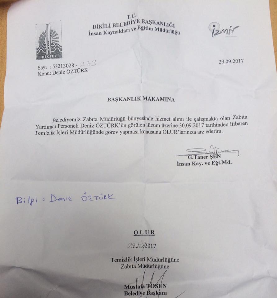 Dikili Belediyesi'nde Zabıta Yardımcı Personeli olarak görevini yapan partili Deniz Öztürk sosyal medya hesabından yaptığı açıklamada Belediye Başkanı Mustafa Tosun'u hedef aldı. Öztürk kendisinin ilçede gerçekleşen mahalle delege seçimlerinde beyaz listeye destek verdiğini ve bu yüzden Temizlik İşleri Müdürlüğü'ne gönderildiğini belirtti. Öztürk, Başkan Tosun'un mavi listelere destek olmasından dolayı kendi göreviyle ilgili yaptırımda bulunduğunu ifade etti.