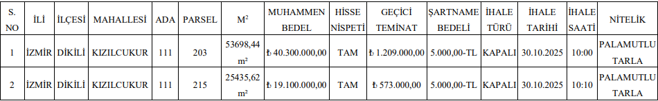 Palamutlu tarla niteliğinde olan iki adet taşınmazın toplam değeri 59.400.000 TL. Kızılcukur Mahallesi’nde bulunan taşınmazların toplam büyüklüğü ise 79.134,06 metrekare. 30 Ekim’de kapalı ihale usulü satılacak olan tarlaların belediye kasasına bütçe oluşturması bekleniyor.