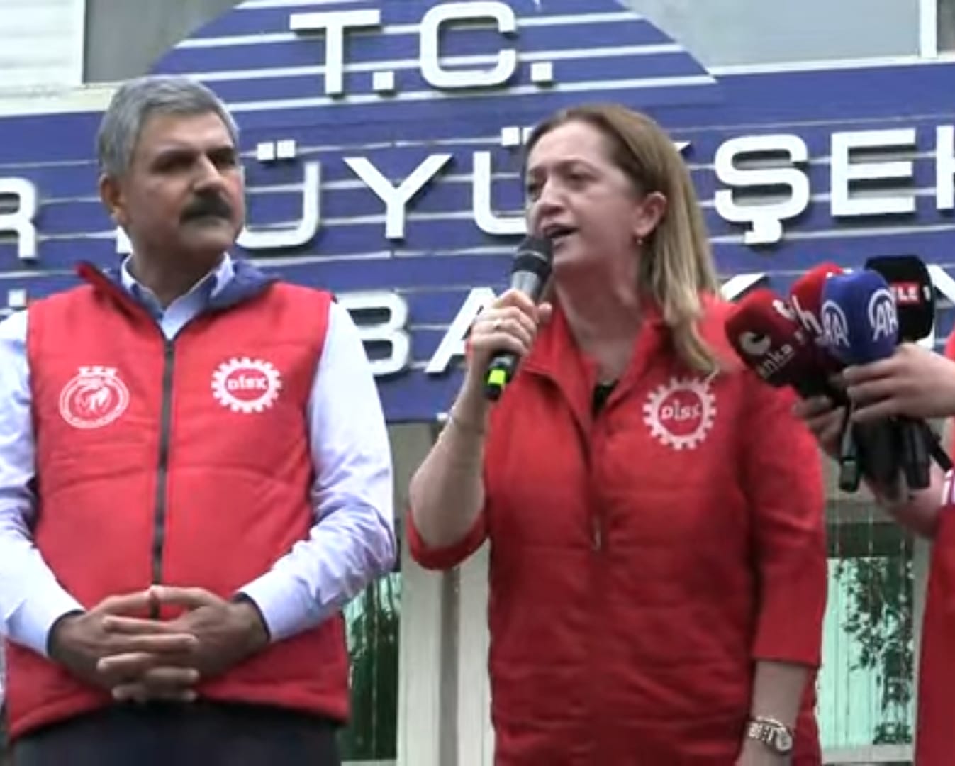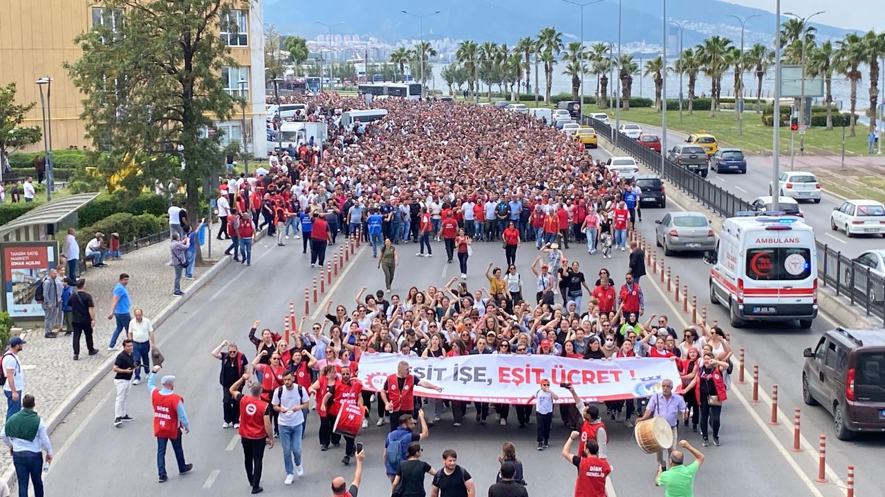 “İzmir halkı, Türkiye halkı kaygı duymasın tarihimizden aldığımız güçle emeğimize sahip çıkacağız, demokrasiye de sahip çıkacağız. Bize bunları yaşatanların kimler olduğunu çok iyi biliyoruz. Demokrasinin bütün kırıntılarını ortadan kaldırmaya çalışan, belediyeleri silkeleme adı altında kıskaca alanlara karşı bu mücadeleyi hep birlikte büyütüyoruz. Bugün 5 belediye başkanı daha gözaltına alındı. Halkın iradesini yok sayanlara halkın iradesine saygı duymayı da biz öğreteceğiz. Demokrasi sendikadır, işçinin ekmeğidir, grev yapabilmektir.
