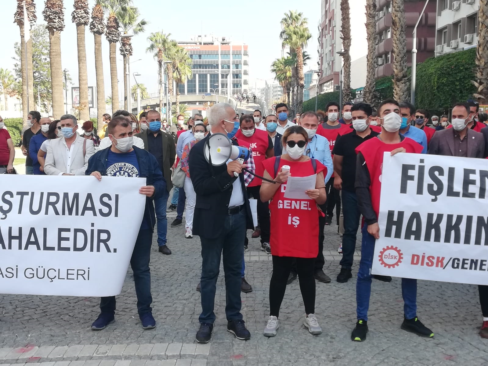 DİSK Ege Bölge Temsilcisi Memiş Sarı yaptığı açıklamada 'Bir soru sormak istiyoruz. Sabıkanızda hiçbir suçunuz yok. Sabah kalkıp ailenizle vedalaşıyorsunuz işe gidiyorsunuz ve bir bakıyorsunuz ki aslında işiniz varken İzmir Valiliği'nin bir kararıyla işsiz kalıyorsunuz. Aslında bu işsiz bırakma hikayesi kendilerinden olmayanlara çalışma hakkının gaspıdır. Bu bir sosyal cinayettir. Biz İzmir Emek ve Demokrasi Güçleri olarak bu sosyal cinayete izin vermeyeceğiz. Bu ülkenin üretenleri ülkenin dışlanmışları olarak kabul ediliyor. Sekiz sene önce Soma'da, Ermenek'te haklarını alamayan, kolları kopan, ayakları parçalanan ve hayatlarını yitiren maden işçileri de direnişte. Ve bu iktidar emekçilerin karşısında her türlü zalimliği göstermek için her türlü kanunu çıkarmak için bugün yasa tekliflerini Meclis'e sunmakta ama buradan bir kez daha iktidarı uyarıyoruz. 18 yıllık iktidarınız 100 yıllık işçi sınıfını ezemez. İşçi sınıfının sabrını sınamayın. Size gerekli cevabı sandıkta da alanlarda da verecektir' ifadelerini kullandı.