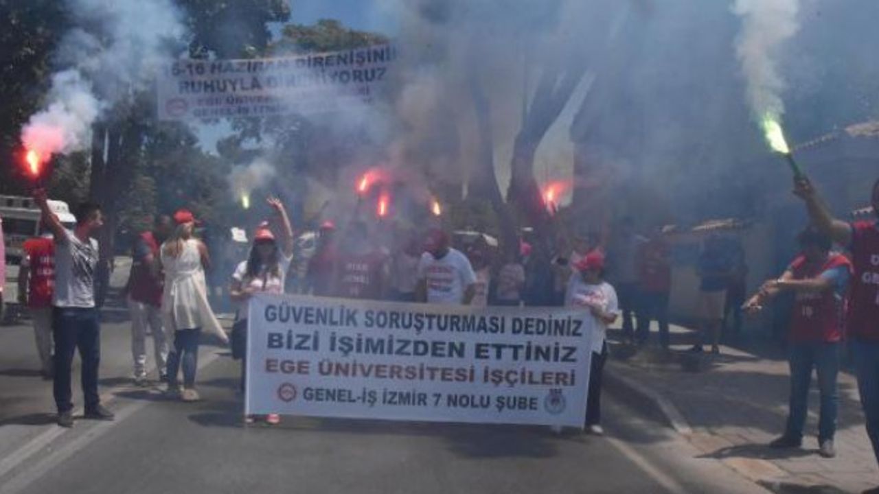 DİSK üyeleri, 15- 16 Haziran işçi eylemlerinin yıl dönümünde, yarım gün süreyle iş bıraktı. İşçilerin koşulsuz kadrolu ve güvenceli olarak istihdamının sağlanmasını isteyen DİSK üyeleri, Bornova metro durağı önünde toplandı. DİSK üyesi işçiler, Ege Üniversitesi'nde güvenlik gerekçesiyle kadro alamayan ve işten çıkarılan işçilere destek vermek için buradan Rektörlük binası önüne kadar yürüdü. '15- 16 Haziran ruhu ile güzel günlere yürüyoruz' pankartı ile yürüyen işçiler; 'İş ekmek yoksa barış da yok', 'Kadro dediniz işimizden ettiniz', 'Zafer direnen emekçinin olacak' sloganları attı. İşçilere; HDP, KESK, TMMOB üyeleri ile CHP İzmir milletvekili adayı Kani Beko da destek verdi.