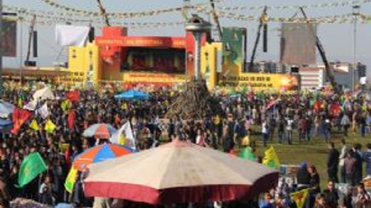 Kürtçe ve Türkçe, ''Nevruz kutlu olsun'' yazılı flamaların asıldığı alana girişler sırasında tertip komitesinin de görevlendirdiği 10 bin kişi alandaki koordinasyonu sağlamaya çalıştı.