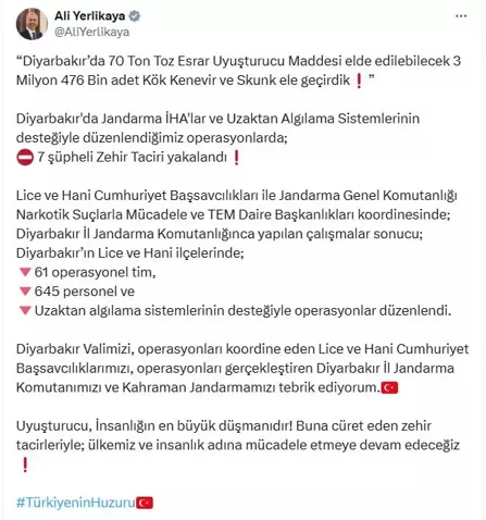 İçişleri Bakanı Ali Yerlikaya, Diyarbakır'ın Lice ve Hani ilçelerinde jandarma tarafından düzenlenen narkotik operasyonunu sosyal medya hesabından paylaştı. Buna göre; 61 operasyonel tim ve 645 personelin katılımıyla düzenlenen, uzaktan algılama sistemlerinin kullanıldığı operasyonda, 70 ton toz esrar elde edilebilecek 3 milyon 476 bin kök kenevir ve skunk ele geçirildi, 7 şüpheli gözaltına alındı.