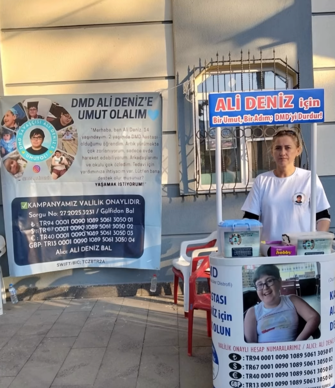 12 yıldır kas kaybı yaşadığı için artık hareket kabiliyeti çok düştü ve tekerlekli sandalyeye mahkum duruma geldi. Bu bizim için çok kötü bir durum çünkü hastane tedaviyi tamamen tekerlekli sandalyeye mahkum olmuş çocuklara uygulamıyor. Kalp, solunum ve yutkunma kasları zarar görmeden yani makinaya bağlı kalmadan bu tedaviyi almamız gerekiyor. Bu yüzden çok acelemiz var ve Ali Deniz daha çok kas kaybı yaşamadan onu tedaviyle buluşturmamız gerekiyor.