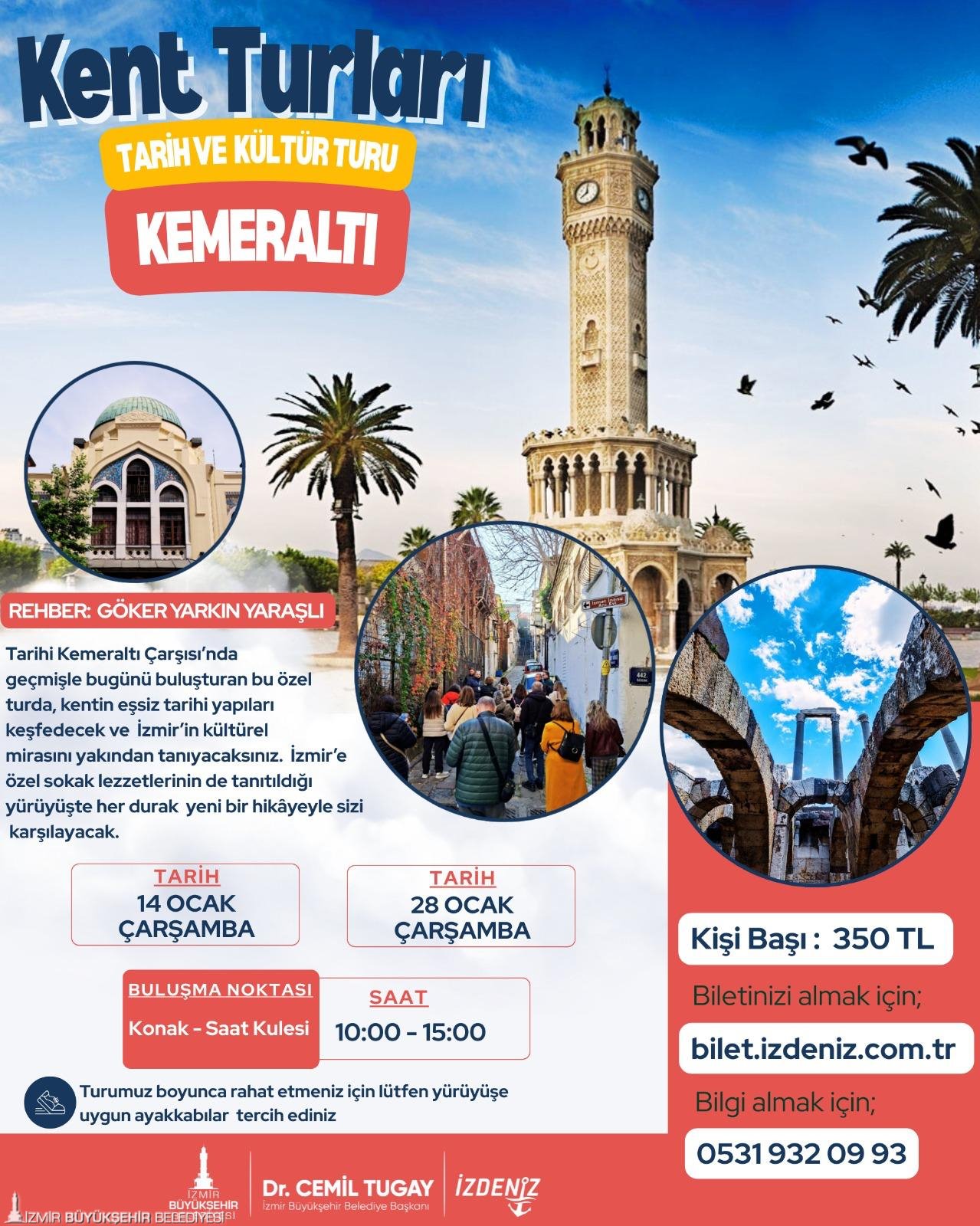 Kemeraltı Turları, ziyaretçilere körfezin mavisinden tarihi çarşının renkli sokaklarına uzanan benzersiz bir keşif deneyimi sunuyor. 14 Ocak 2026 Çarşamba ve 28 Ocak 2026 Çarşamba günleri gerçekleştirilecek turlar, 10.00–15.00 saatleri arasında yapılacak. Tur kontenjanı 25 kişiyle sınırlı tutulurken, ücret 350 lira olarak belirlendi. Etkinlik 12 yaş ve üzeri katılımcılara açık olacak. Saat Kulesi’nden başlayacak tur güzergâhında; Devlet Opera ve Balesi Elhamra Sahnesi (dışarıdan), Milli Kütüphane (dışarıdan), Eski Hapishane, Gureba-i Müslimin (bugünkü İl Sağlık Müdürlüğü), Arap Fırını, Eski Medine Yokuşu – İsmet İnönü Sokağı, İnönü Müzesi, Tarihi Kemeraltı Hamamı, Salepçioğlu Camisi, Başdurak Camisi (El Sanatları), Ayşa Boşnak Börekçisi, Piyaleoğlu Han (çini sanatçısı Ebru Camkıran’ın atölye ziyareti), Havra Sokağı, Etz Haim Sinagogu (dışarıdan), Agora Ören Yeri (içeri girilerek rehber anlatımıyla) ve Hisarönü Şambalicisi (işletme sahibi anlatımıyla) yer alıyor. Tur süresince satın alınacak yiyecek ve içecekler katılımcılar tarafından karşılanacak. Agora Ören Yeri’ne girişler Müze Kart sahipleri, öğrenciler ve 65 yaş üstü ziyaretçiler için ücretsiz olacak.
