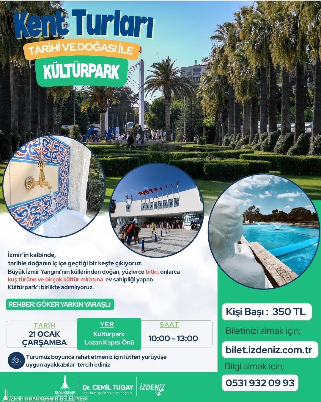 Kültürpark Turları, kentin tarihine, kültürüne ve doğasına rehber eşliğinde yakından bakma fırsatı sunuyor. 21 Ocak 2026 Çarşamba günü 10.00–13.00 saatleri arasında gerçekleştirilecek turda buluşma noktası Kültürpark Lozan Kapısı önü olarak belirlendi. Turun ücreti 350 lira olurken, kontenjan 25 kişiyle sınırlı tutuldu. Etkinlik 12 yaşından büyük çocuklar için uygun.