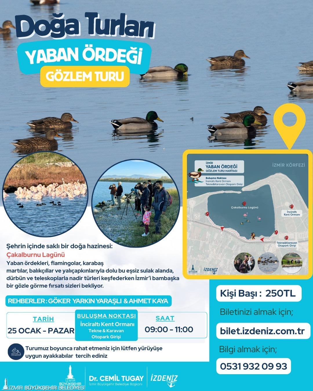 İzmir’in doğal zenginliklerinden biri olan Çakalburnu Lagünü’nde düzenlenen yaban ördeği gözlem turları doğaseverleri buluşturuyor. 25 Ocak 2026 Pazar günü 09.00–11.00 saatleri arasında gerçekleştirilecek tur, İnciraltı Kent Ormanı Tekne & Karavan Otoparkı girişi önünden başlayacak. Kişi başı ücretin 250 lira olarak belirlendiği turun kontenjanı 30 kişiyle sınırlı.