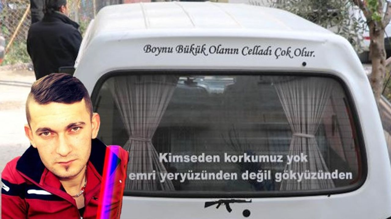 Cinayete kurban giden Burak Durna'ya ait minibüsün üzerinde bulunan 'Kimseden korkumuz yok. Ölüm emri yeryüzünden değil gökyüzünden' ve 'Boynu bükük olanın celladı çok olur' yazıları dikkat çekti. (DHA)