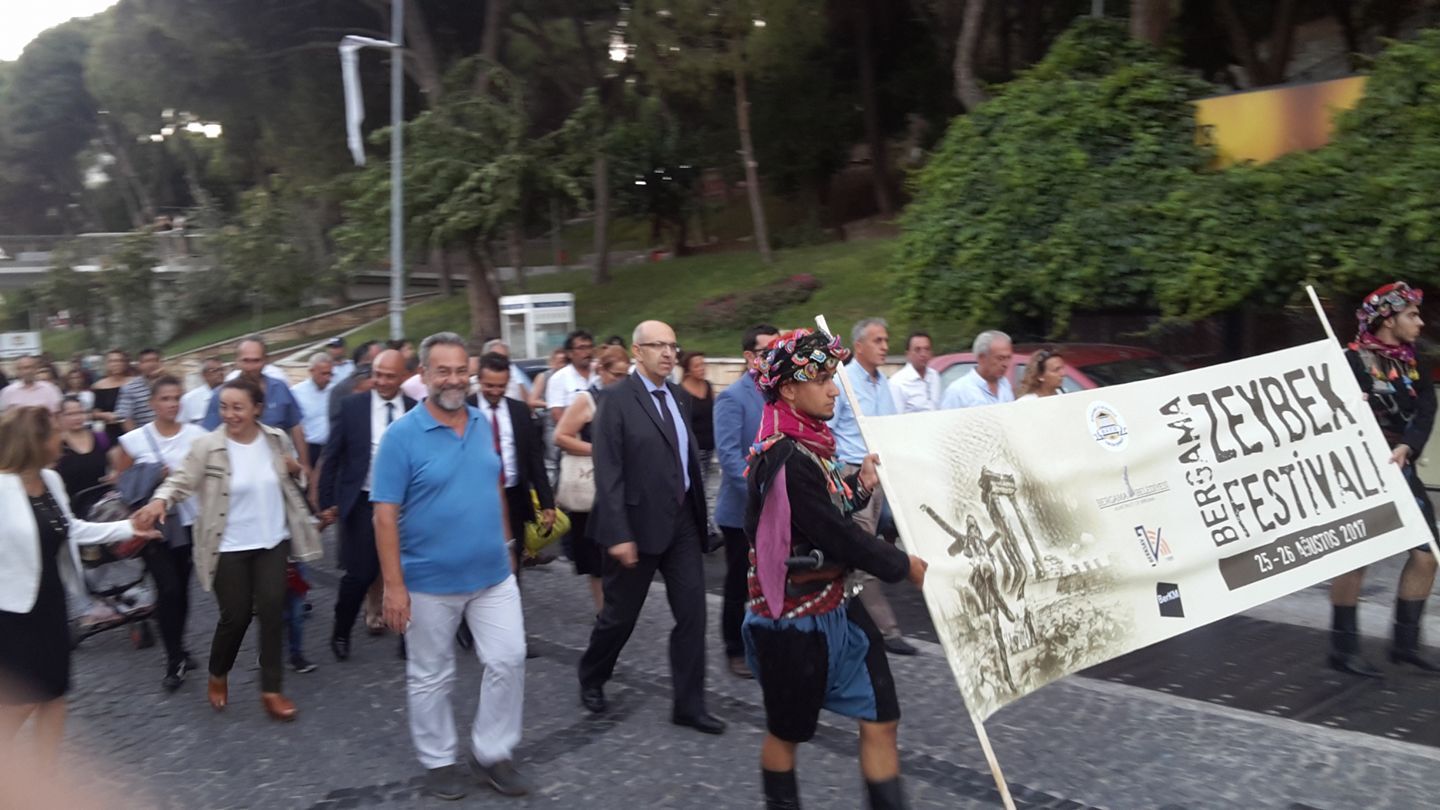 BerKM'de yapılan etkinliklerin ardından Maltepe Mahallesi'ndeki Atatürk Kapalı Spor Salonu önünden Cumhuriyet Meydanı'na kadar Bergama Zeybek Festivali Kortej Yürüyüşü yapıldı. Yürüyüş sonrası Cumhuriyet Meydanı'nda saygı duruşu ve İstiklal Marşı sonrası açılış konuşmalarına geçildi. Burada konuşma yapan Başkan Gönenç, 'Bugün Bergama'da efe sesi var ama ilçede Anadolu'da, Ege'de yüzyıllardır Efe sesi var. Onların ayak sesi var. Onların diz vuruşları var. Onların geçmişten günümüze gelen destansı öyküleri, onların kültürüne, felsefesine ayrı bir bağlılık yaratıyor. Hep haksızlığa karşı durmuşlar. Vatanlarına, topraklarına, namuslarına bir el uzandığında dimdik duruşlarıyla bütün bu adaletsizliklerin önüne geçmişler. O yüzden bu ülkenin insanları onları bir başka seviyor. Bugün de biz Zeybek Festivalini anlamlı bir günde başlamasını istedik. Bu yüzden tarih olarak 26 Ağustos'u seçtik. 26 Ağustos bir başka efenin, bu toprakların, bu ulusun büyük kurtarıcısı, şayak kalpaklı, mavi gözlü, sarışın dev adamın büyük taarruzu başlattığı akşam. Tam 95 yıl önce şafak sökerken, sabaha karşı Kocatepe'de başlayan büyük direnişin, 30 Ağustos Zaferiyle taçlandığı gün. Bu zaferden sonra Türk ulusunun eşsiz ve ebedi başkomutanı doğmuştu. Cumhuriyet'in kurulmasıyla da birlikte aydınlık günler başladı. Bugün hala cumhuriyetin bize sunduğu erdemlerle yaşıyoruz' dedi.