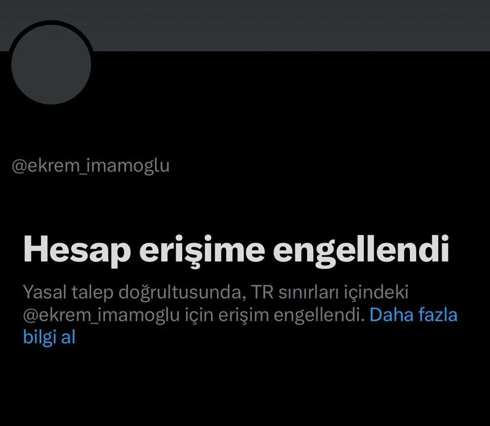 İstanbul Büyükşehir Belediyesi'ne yönelik operasyonda tutuklanan ve görevden uzaklaştırılan Ekrem İmamoğlu'nun X hesabı mahkeme kararıyla erişime kapatıldı.