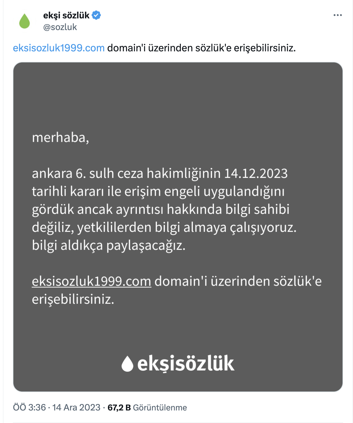 EngelliWeb'in aktardığına göre, Ekşi Sözlük'ün bu alan adı, 'milli güvenlik ve kamu düzeninin korunması gerekçesiyle' Ankara 6'ncı Sulh Ceza Hakimliğinin 14 Aralık 2023 tarihli ve 2023/13768 sayılı kararıyla erişime engellendi.