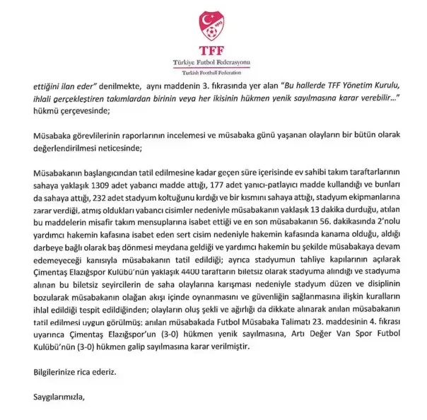 "Müsabakanın başlangıcından tatil edilmesine kadar geçen süre içerisinde ev sahibi takım taraftarlarının sahaya yaklaşık 1309 adet yabancı madde attığı, 177 adet yanıcı-patlayıcı madde kullandığı ve bunları da sahaya attığı, 232 adet stadyum koltuğunu kırdığı ve bir kısmını sahaya attığı, stadyum ekipmanlarına zarar verdiği, atmış oldukları yabancı cisimler nedeniyle müsabakanın yaklaşık 13 dakika durduğu, atılan bu maddelerin misafir takım mensuplarına isabet ettiği ve en son müsabakanın 56. dakikasında 2'nolu yardımcı hakemin kafasına isabet eden sert cisim nedeniyle hakemin kafasında kanama olduğu, aldığı darbeye bağlı olarak baş dönmesi meydana geldiği ve yardımcı hakemin bu şekilde müsabakaya devam edemeyeceği kanısıyla müsabakanın tatil edildiği; ayrıca stadyumun tahliye kapılarının açılarak Çimentaş Elazığspor Kulübü'nün yaklaşık 4400 taraftarın biletsiz olarak stadyuma alındığı ve stadyuma alınan bu biletsiz seyircilerin de saha olaylarına karışması nedeniyle stadyum düzen ve disiplinin bozularak müsabakanın olağan akışı içinde oynanmasını ve güvenliğin sağlanmasına ilişkin kuralların ihlal edildiği tespit edildiğinden; olayların oluş şekli ve ağırlığı da dikkate alınarak anılan müsabakanın tatil edilmesi uygun görülmüş; anılan müsabakada Futbol Müsabaka Talimatı 23. maddesinin 4. fıkrası uyarınca Çimentaş Elazığspor'un (3-0) hükmen yenik sayılmasına, Artı Değer Van Spor Futbol Kulübü'nün (3-0) hükmen galip sayılmasına karar verilmiştir."