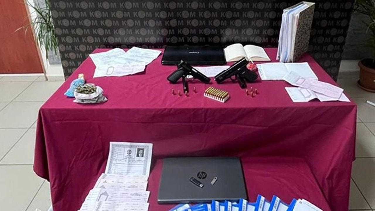 Adreslerdeki aramalarda çok sayıda dolu ve boş senet, mağdurlara ait kimlik fotokopileri, icra kesinti dilekçeleri, alacaklı ve borçluların listelendiği klasör, borçlu ve borç miktarlarının yazılı olduğu ajanda, 150 gram esrar, şüphelilere ait çok sayıda dijital materyal, 2 ruhsatsız tabanca ve 60 fişek ele geçirildi.