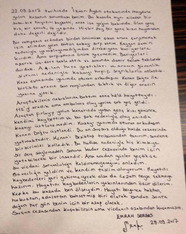 Olaydan sonra İstanbul'a gittiğini anlatan Emrah Serbes, 'Özel bir psikiyatri kliniğinde 4-5 gün kadar yattım ve tedavi oldum. Kendimi cezaevi koşullarına ruhsal ve bedensel olarak hazırladım. Daha sonra İzmir Torbalı Cumhuriyet Başsavcılığına gelerek teslim olmaya karar verdim. Cezam neyse çekmeye razıyım' ifadelerini kullandığı öğrenildi.