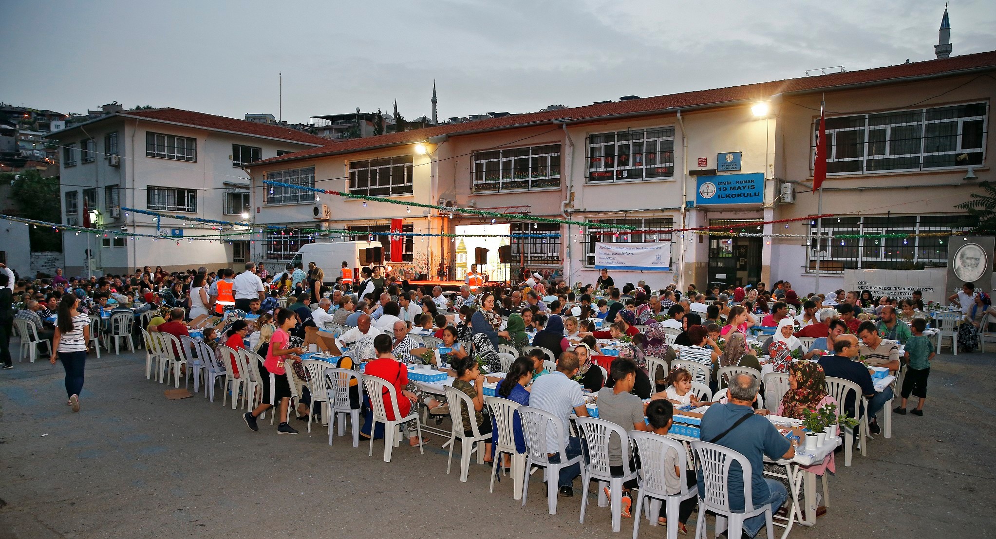 Konak Belediyesi'nin Ramazan ayı dolayısıyla düzenlendiği mahalle iftarları sürüyor. Her gün farklı bir mahallede kurulan bereket sofrası bu kez 19 Mayıs İlköğretim Okulu'nun bahçesinde kuruldu. İftar yemeğine Vezirağa, 19 Mayıs ve Hasan Özdemir mahallelerinden vatandaşlar katıldı. Okul bahçesine kurulan masalarda buluşan yüzlerce kişi aynı anda orucunu açtı. Konak Belediye Başkanı Sema Pekdaş'ın ev sahipliği yaptığı iftar yemeğine Cumhuriyet Halk Partisi (CHP) Konak İlçe Başkanı Çağrı Guruşçu, CHP Konak İlçe Kadın Kolları Başkanı Nurten Serhadbeyi ve mahalle muhtarları katıldı. Okunan ezanın ardından tüm davetliler Konak Belediyesi'nce ikram edilen çorba, İzmir köfte, pilav, ayran ve tatlıdan oluşan iftar mönüsüyle oruçlarını açtı.