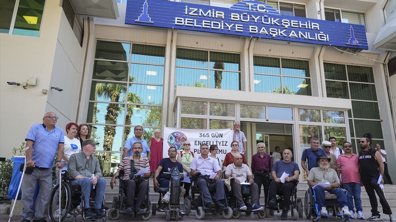 Yaklaşık 20 kişilik engelli grup, Kültürpark Fuar Alanı'ndaki Büyükşehir Belediyesi hizmet binası önünde bir araya geldi.