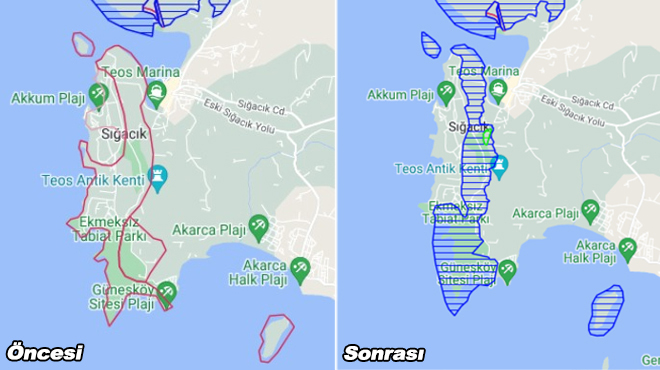 Yine geçtiğimiz günlerde Resmi Gazete'de yer alan duyuru ile birlikte Sığacak ilçesindeki 1'inci derece doğal SİT bölgesinde değişikliğe gidilmişti. Bölgedeki bazı bölgelerin tamamen SİT özelliği kaldırılırken bazı bölgelerinde SİT dereceleri 2'ye ve 3'e düşürülmüştü. Özellikle deniz kenarındaki bölgelerin SİT özelliğinin kaldırılarak bu bölgelerin yapılaşmaya açılması dikkat çekmişti.