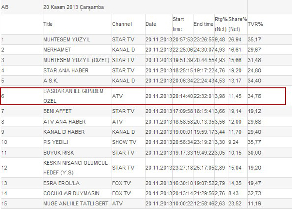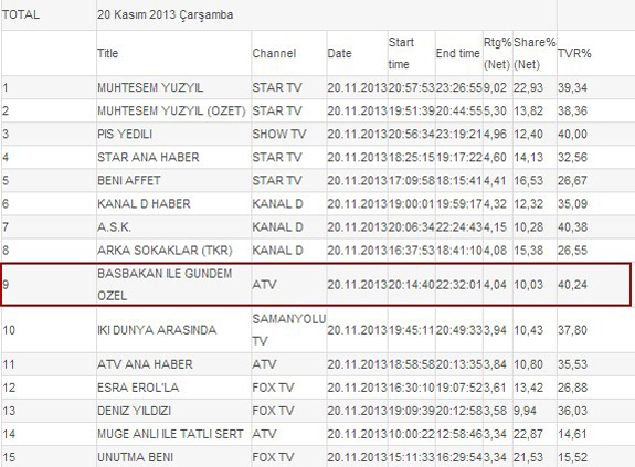 Saat 20:14 ile 22:32 arasında ekrana gelen 'Başbakan ile Gündem Özel' ise TOTAL'de yüzde 10,03'lük izlenme payı ile 9. sırada, AB'de de yüzde 11,45'lik