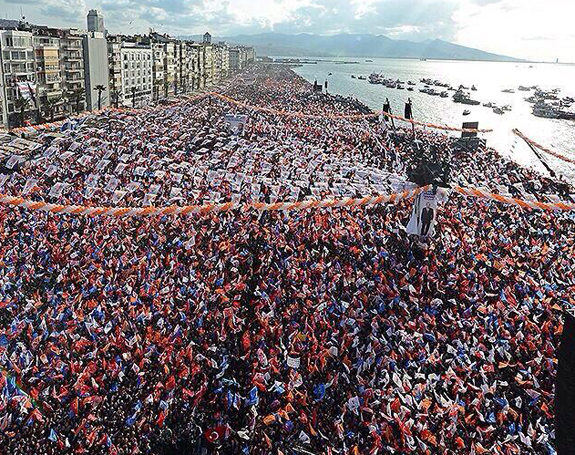 İzmir'e neredeyse bölgenin tüm illerinden AK Partililer akın ederken resmi olmayan rakamlara göre yaklaşık 250 bin kişi Başbakan Erdoğan'ı dinlemeye geldi. Gündoğdu Meydanı'nda yaptığı İzmir mitingine denizden parti bayraklarıyla süslü tekneler, gemiler eşlik etti. Alana bakan bazı apartmanların balkonlarına 'Kumral devrimci', 'Antiemperyalist devrimci' yazılı afişler asıldı. Yoğun güvenlik önlemlerinin alındığı alana bakan tüm sokaklar demir bariyerle çevrildi, apartmanlara keskin nişancılar yerleştirildi. Alan, turuncu beyaz balonlarla süslendi. Alandaki Hürriyet heykeli, Başbakan Erdoğan'ın posterleriyle süslendi. Başbakan'ın, Ak Parti İzmir Büyükşehir Belediye Başkan adayı Binali Yıldırım ile birlikte fotoğrafının yer aldığı afişte 'Beraber yürüdük biz bu yollarda' yazıldı. Alana LED ekranlar yerleştirildi.