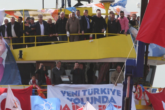 Başbakan Erdoğan, yerel yönetimleri eleştirerek, İzmir'de seçimi kazanmak için kadınlardan şöyle yardım istedi. 'İzmir'e dünyanın en ileri limanı yapılıyor. Bunların hayali bile buna erişemez. Otoyol temelini attık. İzmir-İstanbul arasının en önemli aksı bitti. Bir taraftan beş ayrı noktada otoyol yapılıyor. 8 saatlik İzmir-İstanbul arası 3.5 saate düşüyor. Şimdi Allah aşkına bunu ortaya koyan bir AK Parti mi yoksa af edersin bir modern çöplük bile icra edemeyen CHP mi? Önce hanım kardeşlerime sesleniyorum. Bu işi siz bitireceksiniz. Beyler kızmıyorsunuz değil mi? Çünkü kale içeriden fethedilir. 15 günümüz var. 15 gün kapı kapı dolaşmaya var mıyız? Evvel Allah bu iş bitmiştir. Burada denizde balıkçı motorlarını görüyorum. Onların buraya kattıkları heyecanı kalpten selamlıyorum. Bugün İzmir başka diyorum ya işte bundan dolayı.'