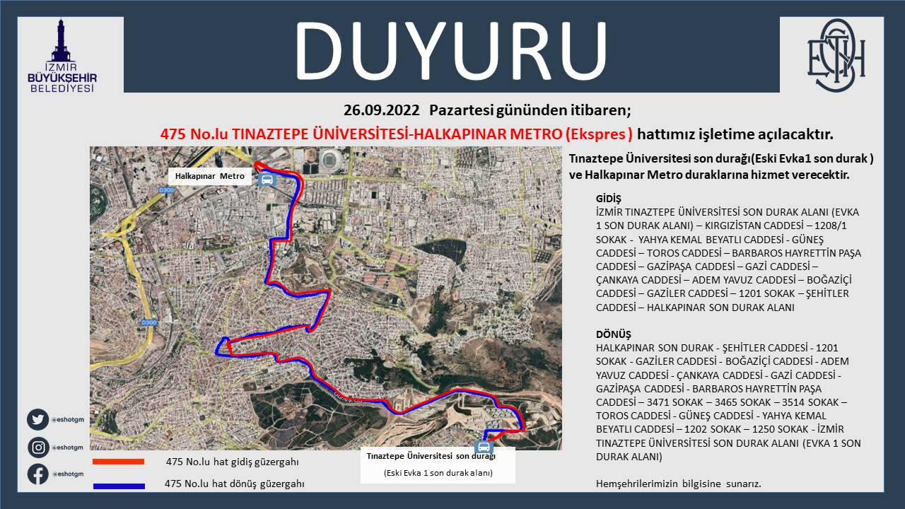EGEDESONSÖZ- ESHOT yeni bir hattı hizmet vemeye başlayacağını duyurdu. ESHOT'un internet sitesinde yer alan bilgilere göre geçtiğimiz yıl hizmete giren İzmir Tınaztepe Üniversitesi (İZTU) ile Halkapınar Metro arasında sefer yapacak olan 475 numaralı hat 26 Eylül Pazartesi itibariyle kullanıma açılacak