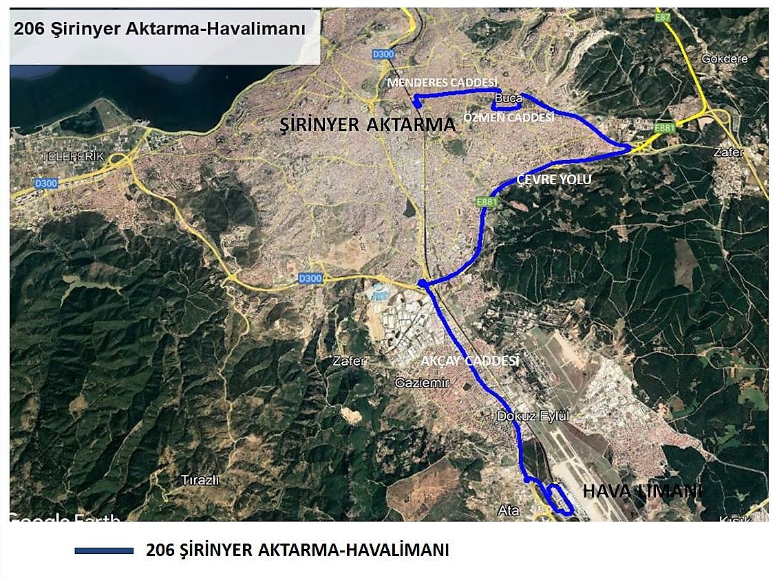 Buca bölgesi sakinlerinden gelen yoğun talep üzerine, Şirinyer Aktarma Merkezi'ni, Adnan Menderes Havalimanı'na bağlayacak 206 numaralı Şirinyer Aktarma – Havalimanı hattı oluşturuldu. Ulaşım Koordinasyon Merkezi (UKOME) tarafından onaylanan yeni hatta, her gece 00.30 – 06.00 saatleri arasında, 120 dakika ara ile hizmet verilecek. Otobüsler, yaklaşık 23 kilometreyi bulan Cemil Şeboy Caddesi – Mehmet Akif Caddesi – Menderes Caddesi – Uğur Mumcu Caddesi – Özmen Caddesi – Kıbrıs Caddesi – Erdem Caddesi – Doğuş Caddesi – İzmir Çevre Yolu – Akçay Caddesi güzergahında çalışacak.