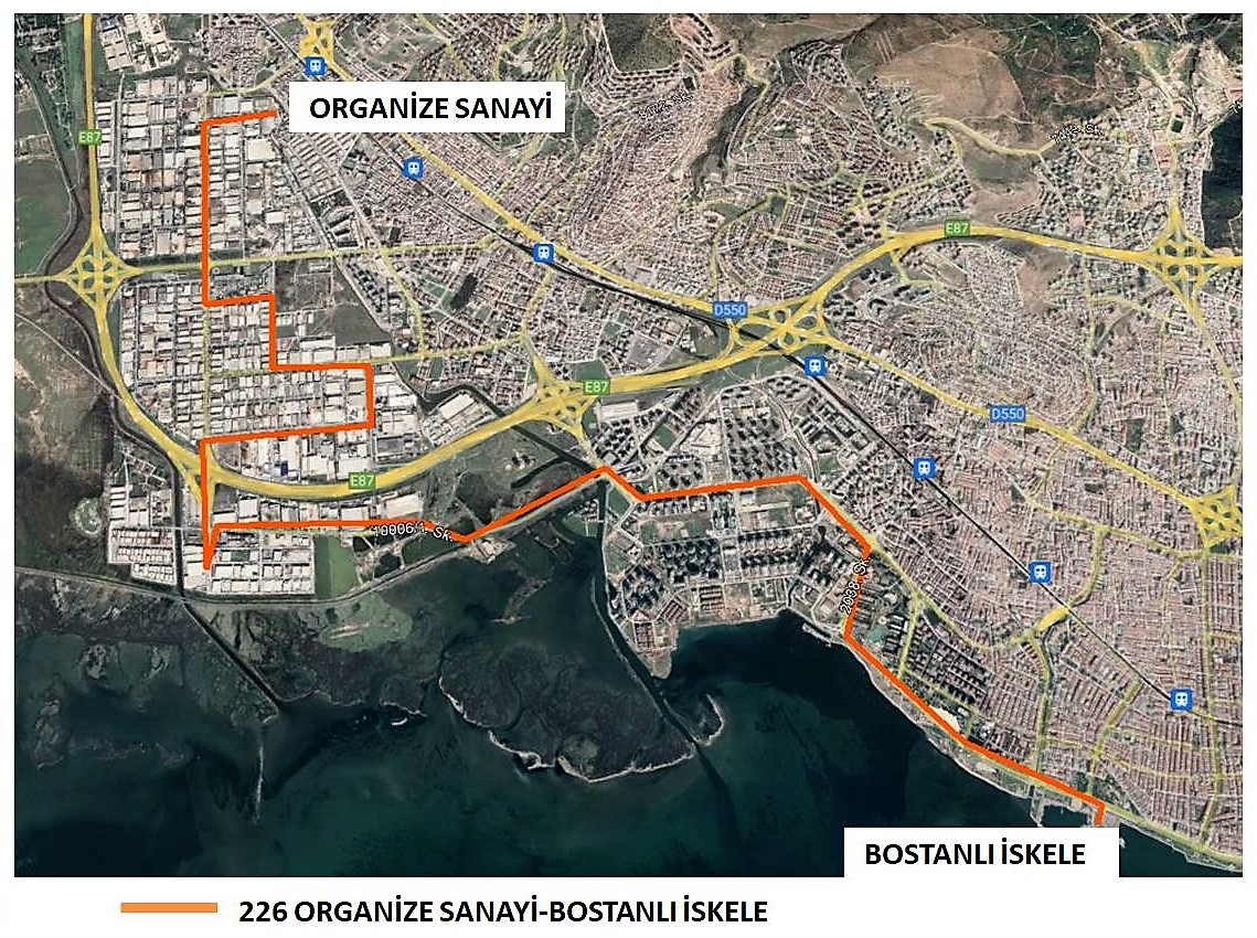 Binlerce kişinin çalıştığı İzmir Atatürk Organize Sanayi Bölgesi'ne (İAOSB), özellikle sabah ve akşam saatlerinde toplu ulaşımı kolaylaştırmayı ve özendirmeyi amaçlayan ESHOT Genel Müdürlüğü, 226 numaralı Organize Sanayi – Bostanlı İskele (Ekspres) hattını da devreye alıyor. UKOME tarafından onaylanan hatta hizmet verecek otobüsler, her gün Bostanlı İskele'den 07.35 ve 08.05; İAOSB'den ise 17.40 ve 18.10'da kalkış yapacak. Araçlar, yaklaşık 14 kilometreyi bulan; Bostanlı İskele – Hasan Ali Yücel Bulvarı – Fazıl Say Caddesi – Cehar Dudayev Bulvarı – 10500 Sokak – 10006/1 Sokak – 10049 Sokak – Mustafa Kemal Atatürk Bulvarı – 10000 Sokak – 10003 Sokak – 10002 Sokak – 10015 Sokak – 10013 Sokak – Mustafa Kemal Atatürk Bulvarı – 10034 Sokak güzergahında hizmet verecek.