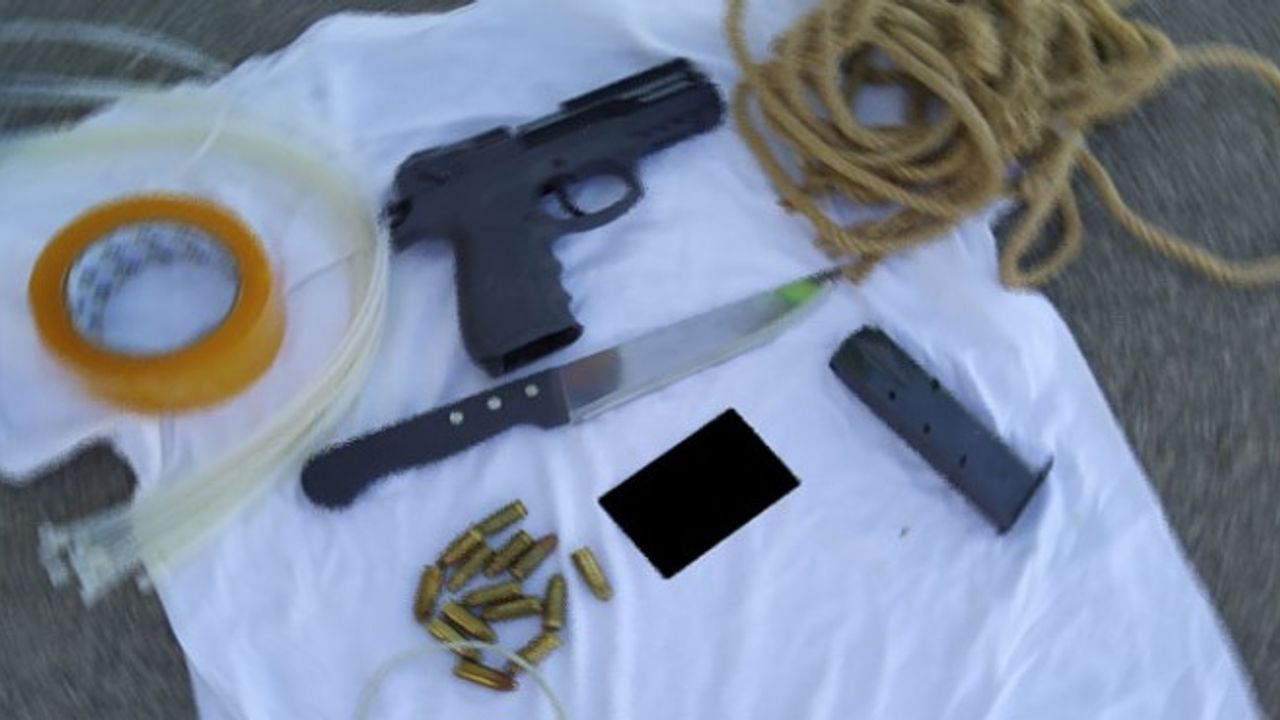 M.A.'nın yapılan üst aramasında; 9 milimetre çapında tabanca, bu silaha ait 14 mermi, 28 santimetre uzunluğunda bıçak, 10 plastik kelepçe, 1'er metre olarak kesilmiş, uçları düğümlü 5 kendir ip ve koli bandı ele geçirildi.