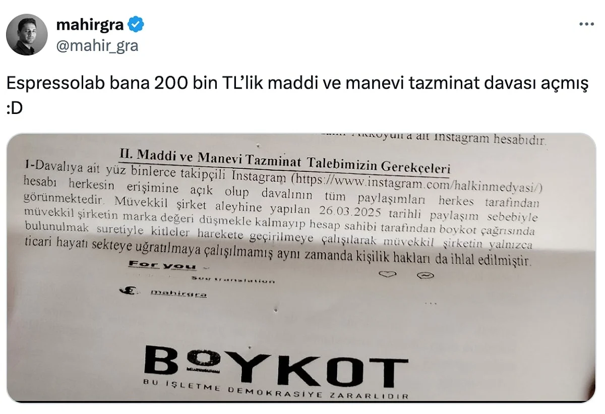 Mahir Akkoyun yaptığı paylaşımda "Espressolab bana 200 bin TL'lik maddi ve manevi tazminat davası açmış" ifadelerini kullanırken, Hüseyin Aygün ise "EspressoLab, 19 Mart sonrası sosyal medyada boykot çağrısı yaptığım için dava açtı, tazminat istiyor" şeklinde paylaşımda bulundu.