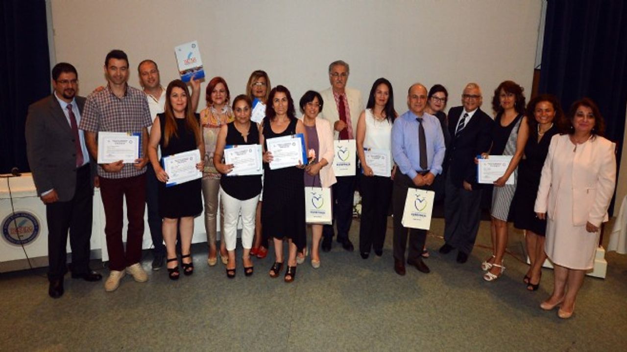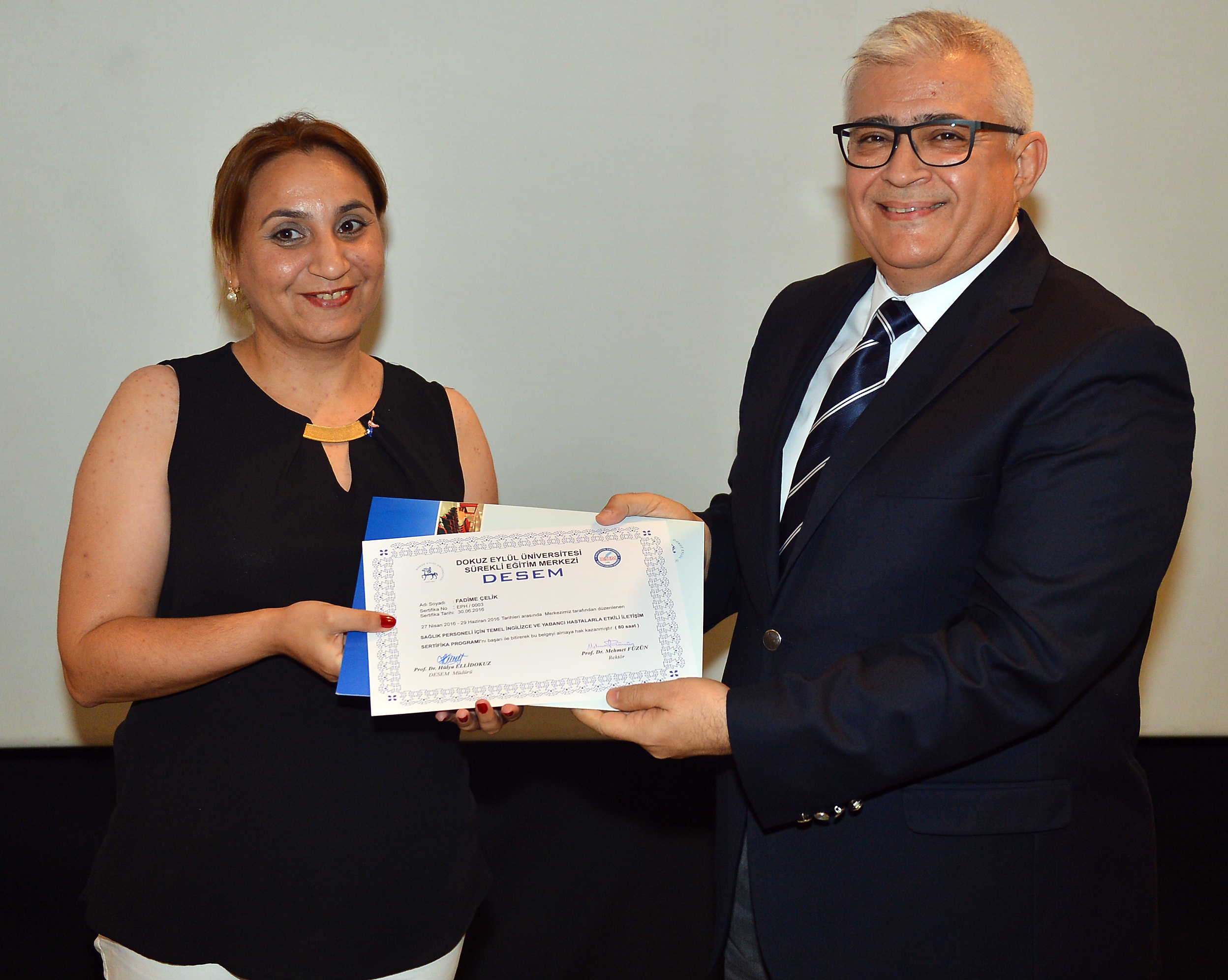 'Sağlık Personeli İçin Temel İngilizce ve Yabancı Konuklar İle Etkili İletişim' programını başarıyla tamamlayan ilk 8 personel törenle sertifikalarını aldı. DESEM'de düzenlenen törene DEÜ Rektör Yardımcısı Prof. Dr. Halil Köse, İzmir Büyükşehir Belediyesi Genel Sekreteri Pervin Şenel Genç, Eşrefpaşa Hastanesi Başhekimi Serdar Pedükcoşkun ile eşi Nazan Pedükcoşkun, eğitmenler ve eğitim gören hastane personeli katıldı.