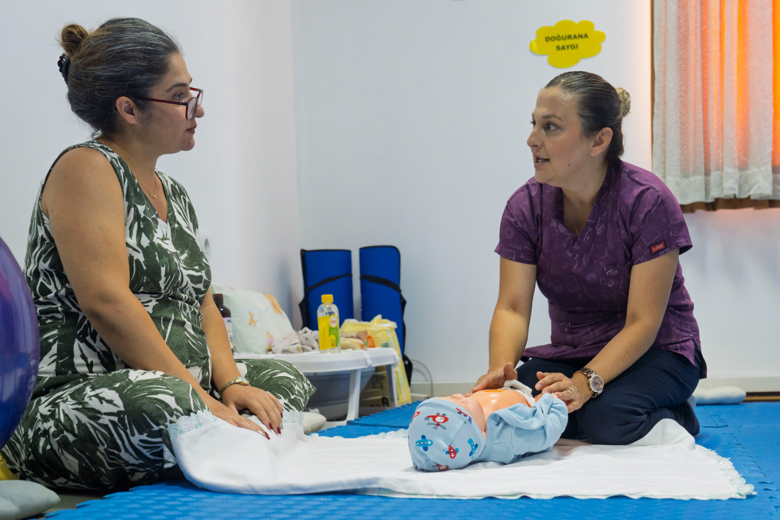 Gebe Okulu’nda koordinatör ebe olarak görev yapan Elif Yalçın da “Gebe Okulu’nda gebelere psikologlarımızla psikolojik destek veriyoruz. Diyetisyen eşliğinde hangi besinleri tüketip tüketmemesi gerektiği ile ilgili bilgi veriyoruz. Pilates, yoga, doğum egzersizi, bebek bakımı, emzirme, bebek banyosu gibi konularda eğitimler veriyoruz. Gebeliğin oluşumundan lohusalık ve emzirmeye kadar olan bütün eğitim içeriklerinin yanı sıra doğum esnasında neler yaşanıldığı gibi konularda da bilgilendirmede bulunuyoruz. Hastalarımız doğumdan sonra da emzirme gibi eğitimleri almak için başvurabiliyor. Sadece doğum yapana kadar olan süreçte değil, doğumdan sonra da lohusa hastalarımızı takip edebiliyoruz. 3 haftalık eğitimin ardından katılım belgelerini gebelere takdim ediyoruz. Eğitimlere baba adayları da katılabiliyor. Çünkü bu süreçte eşe destek çok önemli” diye konuştu.