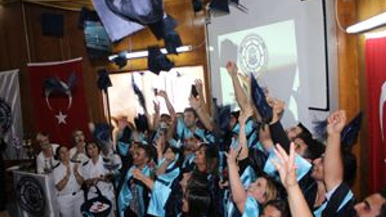 Diploma töreninin ardından sahnede yerini alan mezun öğrenciler, keplerini havaya atarak mezun olmanın coşkusunu yaşadılar.