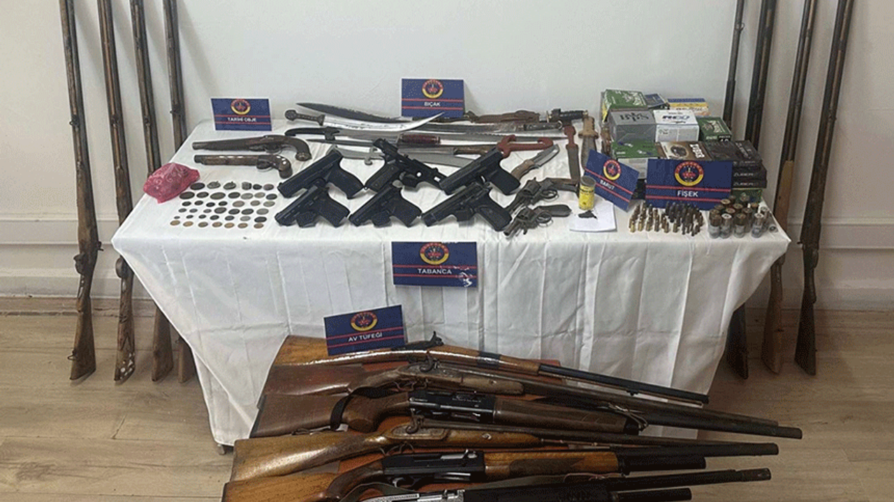 Evde yapılan aramada 2'si tarihi eser niteliğinde 10 tabanca ve 130 fişek, 14 ruhsatsız av tüfeği, 145 sikke, 13 kesici ve delici alet ele geçirildi.