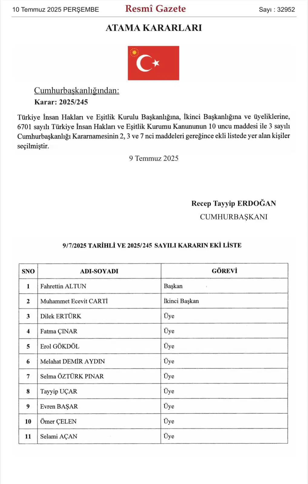 Cumhurbaşkanı kararıyla Cumhurbaşkanlığı İletişim Başkanı Fahrettin Altun, Türkiye İnsan Hakları Eşitlik Kurumu Başkanlığına atandı.
