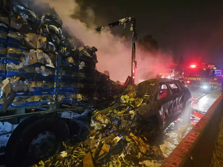 Kazadan yara almadan kurtulan diğer sürücüler ve çevredekiler, yanmaya başlayan otomobildeki Mustafa E. ve yanındaki Hatice Ç.'yi araçtan hafif yaralı olarak çıkardı. Alevler hızla otomobil ve muz yüklü dorseyi sararken, bölgeye itfaiye, sağlık ve jandarma ekipleri sevk edildi. Kazadan yaralı olarak kurtulan Mustafa E. ve Hatice Ç., sağlık ekiplerince hastaneye kaldırıldı. Otomobil ve TIR'ın dorsesini saran yangın, itfaiye ekiplerinin yarım saatlik müdahalesi sonucu söndürüldü. Yangında otomobil tamamen yanarak demir yığınına dönerken, TIR'ın dorsesi de kullanılmaz hale geldi.