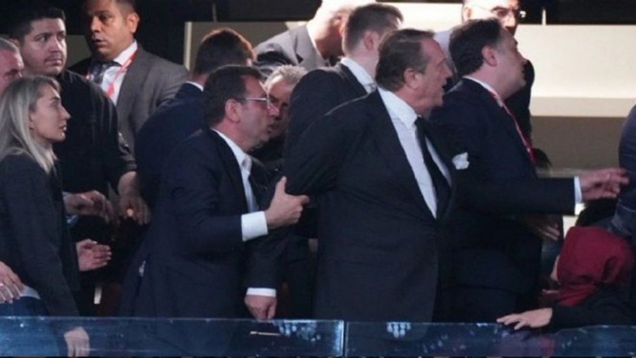 Beşiktaş Başkanı Hasan Arat, İstiklal Marşı esnasında tribünden aşağı Trabzonspor bayrağının çekilmesi üzerine sinirlendi. İBB Başkanı EKrem İmamoğlu ise Hasan Arat'ı tutarak sakinleştirmeye çalıştı.