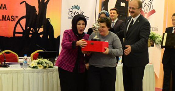 'Girişimci Engel Tanımaz' ve 'Ulaşımda, İletişimde, Hayatın İçerisine Bende Varım' projelerinin engelli vatandaşlar için önemli projeler olduğunu belirten Erdoğan 'Bizler yüreklerimizdeki, gönüllerimizdeki, zihinlerimizdeki engelleri kaldırarak bu projeleri yapmaya devam edeceğiz. Aramızdaki bu görünmez duvarları kaldırdığımızda inşallah birbirimize daha fazla kenetleneceğiz ve geleceğimize daha da güvenle bakabileceğiz' dedi. Erdoğan'a plaket takdimi sırasında platforma çıkan Rukiye Karataş isimli engelli vatandaş salonda duygusal anlar yaşanmasına neden oldu. Önce Emine Erdoğan'a sarılan Rukiye Karataş, ardından plaketi almak istemesi herkesin yüzünde bir tebessüm oluşturdu.