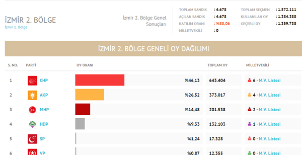 <strong><em>EGEDESONSÖZ - </em></strong> Türkiye tarihi bir günü daha geride bıraktı. Ülke genelinde kurulan bin 236 sandıkta oylarını kullanan vatandaşlar seçimini yaptı.<br /> <br /> Oy verme işlemi saat 17.00 itibariyle sona ererken, YSK flaş bir kararla yayın yasağını öne çekti ve ilk sonuçlar açıklanmaya başladı.<br /> <br /> <strong>İŞTE İZMİR 2.BÖLGE'DEN SONUÇLAR<br /> <br /> <img alt="" src="https://egedesonsozcom.teimg.com/egedesonsoz-com/images/image/222bolge.jpg" style="height:308px; width:600px" /></strong>