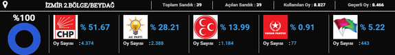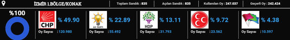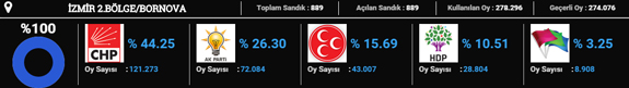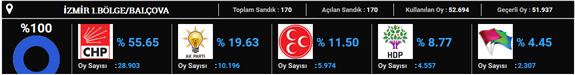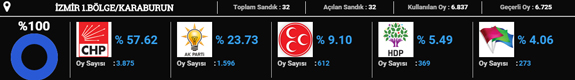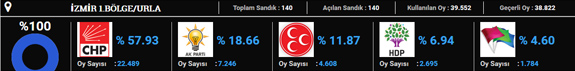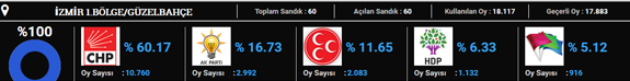 CHP 2015 seçimlerinde en yüksek oyu Karşıyaka'da aldı. Partinin buradaki oy oranı yüzde 64 oldu. Karşıyaka'yı yüzde 60 oyla Güzelbahçe takip etti.