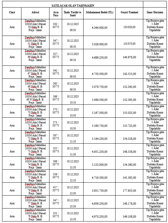 İhale 18 Aralık 2025 günü Foça Belediyesi Encümen Toplantı Salonu’nda gerçekleştirilecek.