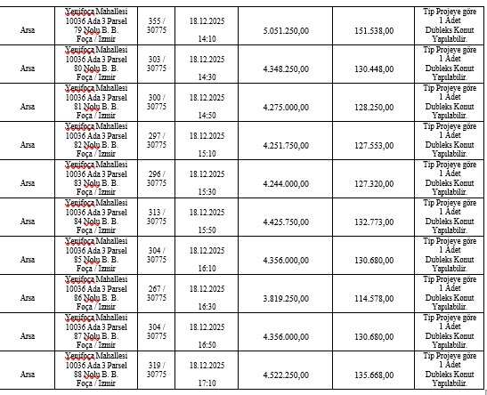 Açık teklif usulü ile gerçekleştirilecek ihalelerin beklenen tutarlar üzerinden gerçekleşmesi halinde Foça Belediyesi, kasasına 118 milyon 274 bin TL koymayı planlıyor.